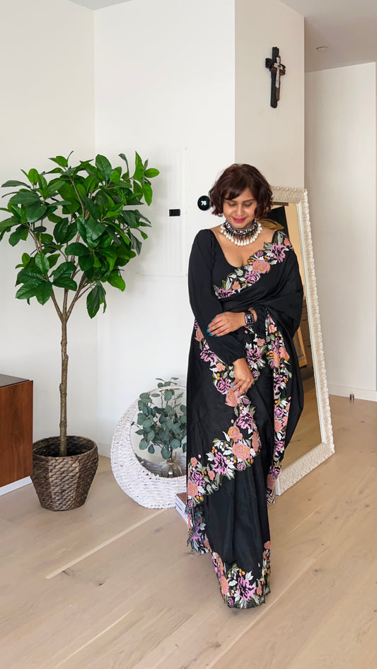 Black Tussar Raw Silk Saree With Embroidery