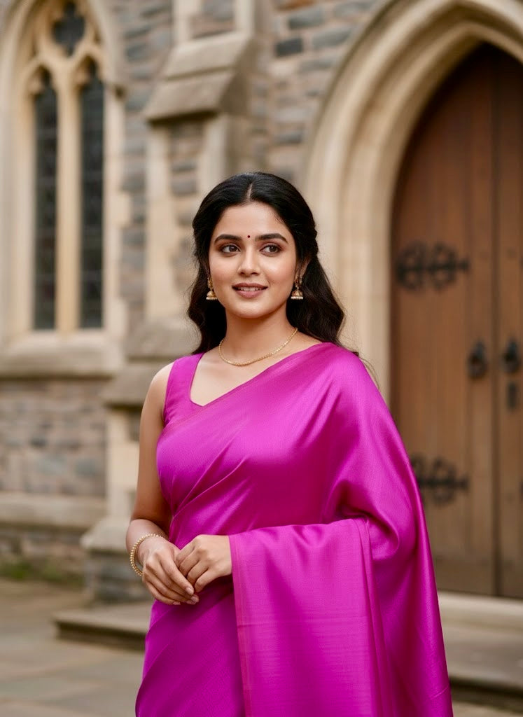 Meet Nandhika — a rich magenta Premium Katan Silk Saree that blends tradition with modern grace.